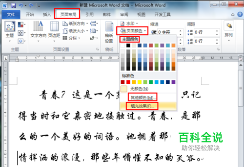 现在添加背景 页面布局——页面颜色——有主题颜色、其它颜色、填充效果