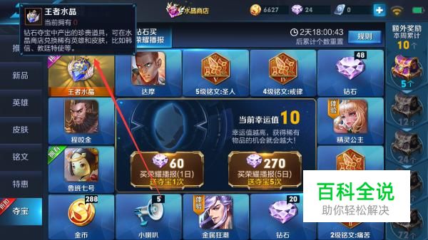 进入夺宝页面后,在这里玩家可以通过点券或者钻石进行夺宝。而王者水晶玩家点击页面中的“钻石买”按键获得。
