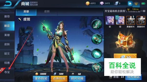 当我们获得王者水晶后,此时可以进入“水晶商店”兑换英雄以及英雄的皮肤。具体操作是先点击游戏中的商城按键,然后在商城页面再点击“夺宝”按键。