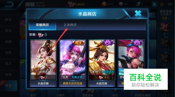 此时会弹出“水晶商店”对话框,然后我们再点击“王者商店”按键。