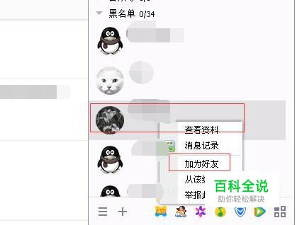 在黑名单中,找到你要恢复好友的昵称,单击右键,选择加为好友;