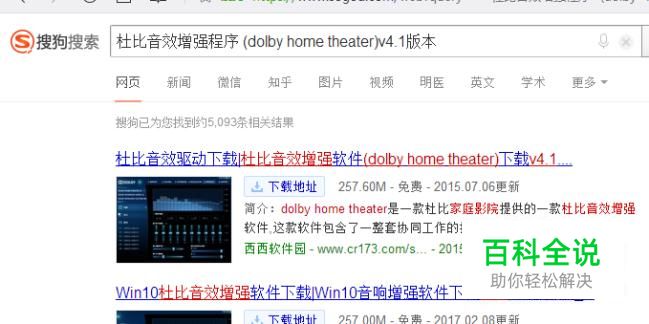 因为是需要安装驱动,所以先需要下载一个杜比音效增强驱动。在搜索引擎中输入 杜比音效增强程序 (dolby home theater)v4.1版本 进行搜索既可以了。