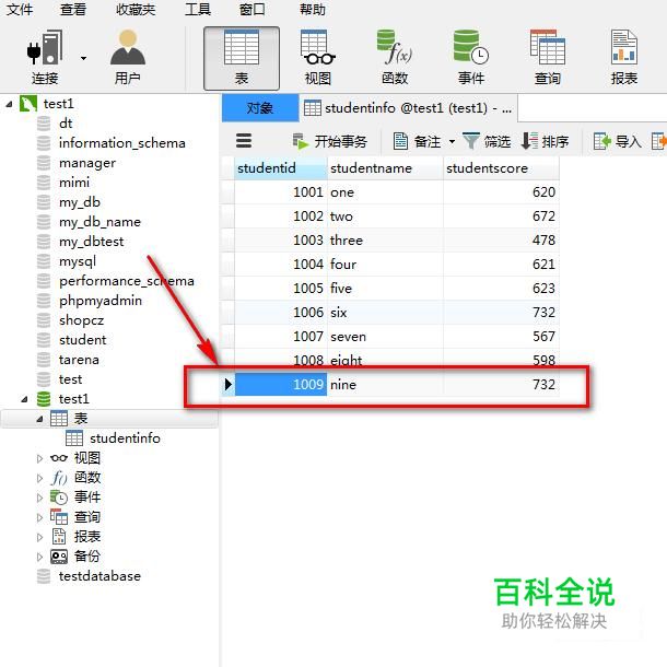如图,比如我有一张数据表studentinfo,我想要删除studentid为1009的这条数据。