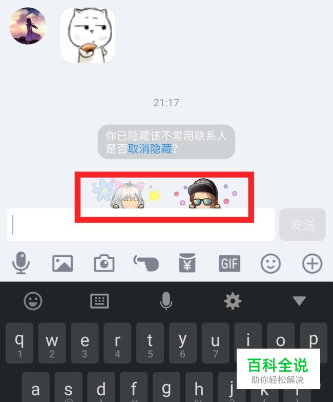 打开与好友的聊天窗口,点击自己的厘米秀人物,如图