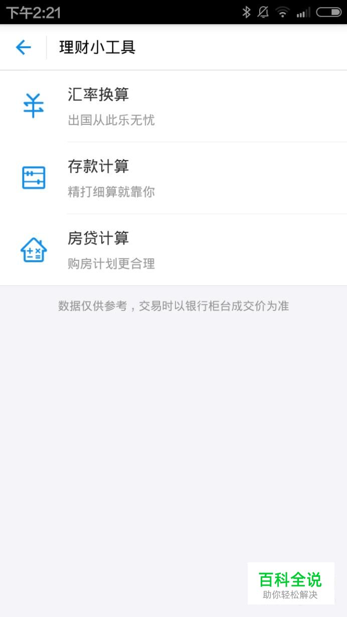 点击进入理财小工具界面,目前有汇率换算、存款计算和房贷计算三种项目。