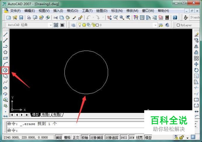 进去操作界面后,利用旁边命令栏中画圆工具(或者输入画圆快捷键“c”),执行画圆命令,在区域画出一适当大小的圆,如图所示:
