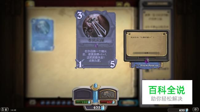 然后回车就可以翻到公正之剑这张卡牌了。公正之剑上场的时机还是比较关键的,五次+1+1,可以让我们手上1-1身材的小兵变成2-2身材还是很给力的。而且,这张卡牌还可以BUFF奥秘召唤出来的随从,比如说救赎。