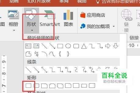 双击打开PPT软件,单击插入选项卡,弹出插入选项卡功能区,在插入功能区,插图组中单击形状,在弹出的下拉菜单中,矩形组中单击矩形,逐一插入四个矩形。
