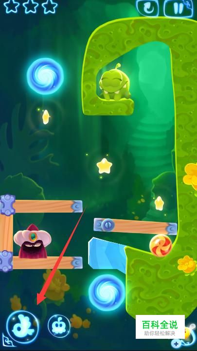 接着国王又会释放引力魔法,将糖果向自己的方向吸引,同时带动木板旋转,小怪会被抛到空中同时吃到第二颗星。