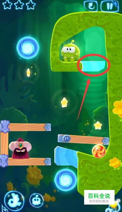 进入4-22关卡后,首先需要将on nom(就是那个绿色的小怪,后面就简称小怪好了)旁边的冰块全部用手指除掉。