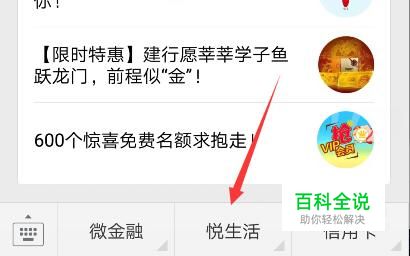 微信关注对应银行公众号之后,点开公众号的对话窗口,点击下方的“悦生活”。