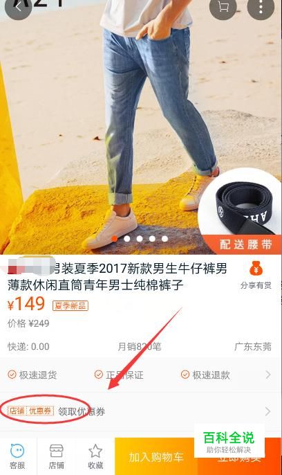 进入商品页之后可以看到该商品的基本情况,如果该店铺有优惠券可以领取的话会在下方有显示领取优惠券的方式,如图。