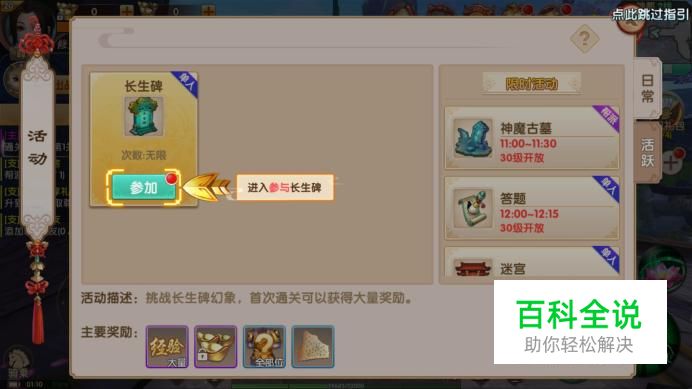 进入活动界面,选择长生碑活动“参加”