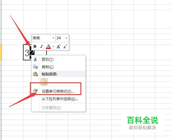 然后我们选中32中的2,之后,点击鼠标右键,然后点击“设置单元格格式”。