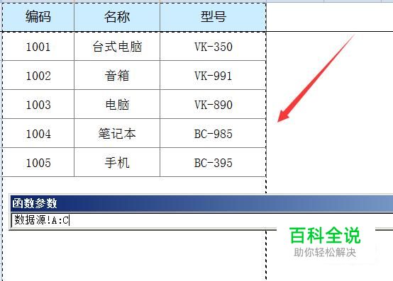 再点击“数据源”后,页面会跳转到数据源表,选中列A到列C,点击后面的向上箭头,页面会返回到函数参数对话框;