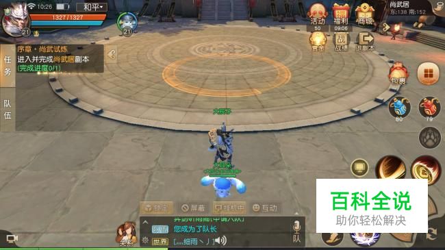 进入尚武居副本地图,可以看到一个圆环的类型对战平台形状,走到圆圈内。