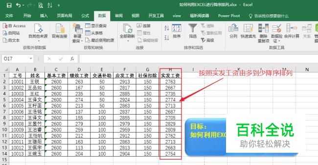 选择点击降序,一样达到工资表按照实发工资由多到少降序排列的目的