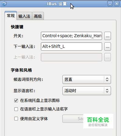 在弹出的IBus设置对话框中,我们可以进行输入法开关、切换、添加删除输入法等很多操作