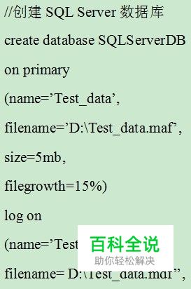 创建SQL Server数据库,由于是关系型数据库,需要创建两个文件,一个是主数据库,存储数据;另一个是日志文件,保存数据库操作记录。 //创建SQL Server数据库 create database 数据库名 on primary (name=主数据库名, filename=数据库路径, size=大小, filegrowth=增长幅度以%为单位) log on (name=数据库日志文件名, filename=日志文件路径, size=大小, filegrowth=增长量以mb为单位)