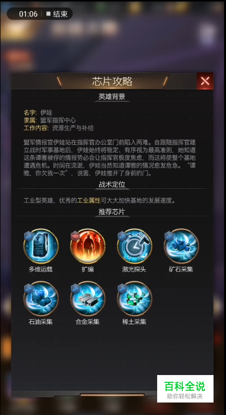 接下来,我们来看英雄伊娃界面的战术定位,通过战术定位我们了解到英雄伊娃是工业型英雄,于是,我们点击战术定位右方的芯片攻略。