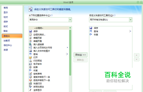 在弹出的“word选项”对话框中,点击左边的“自定义”