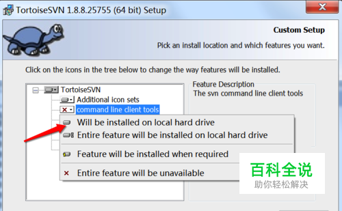 下载TortoiseSVN,并完成安装,安装过程中要注意选择安装SVN命令(command line client tools). SVN的默认安装目录为C:\Program Files\TortoiseSVN\bin