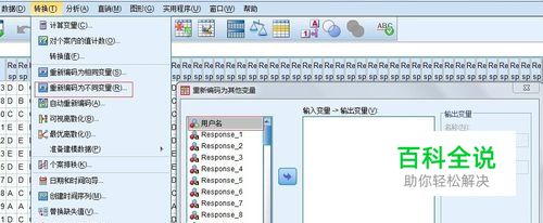 点击“转换”-“重新编码为不同变量”,然后将变量“用户名”勾选入方框。