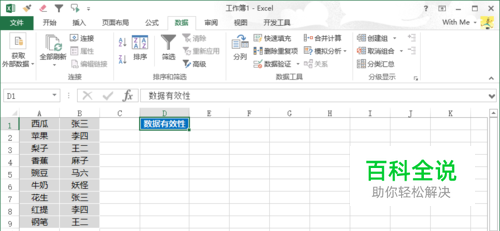 演示版本为Excel2013,其他版本的Excel可参考进行类似操作。启动Excel后, 在A、B两列设置测试数据,并在D列开启数据有效性。
