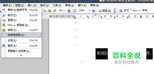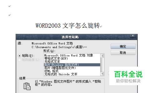 打开word2003,选中要旋转的文字,复制,然后执行菜单栏“编辑——选择性粘贴”。
