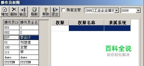 选中该操作员和账套,点击“增加”按钮(以操作员007,账套999为例)