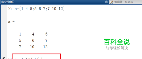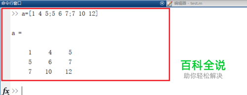 第一步打开matlab,在命令行窗口中输入a=[1 4 5;5 6 7;7 10 12],如下图所示: