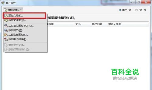 完成第一步之后进入“合并文件”窗口,单击“添加文件”下拉菜单,再选择第一项“添加文件”