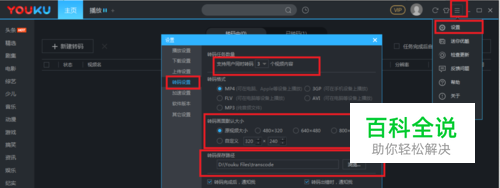 首先打开优酷,点击右上角的:三字样的菜单选项——选择设置——点击转码设置,主要设置一下同时转码的数量,转码画面默认大小以及保存路径——最后保存设置。