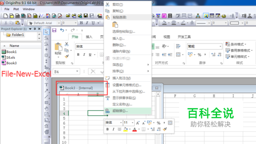 在默认状态下,如果Origin项目中打开的是已经存在的Excel工作簿(通过 open Excel打开),那么该Excel工作簿保存在Origin项目之外;如果要保存的是在Origin项目中新建的Excel工作簿(通过New Excel新建),那么该Excel工作簿将保存在Origin项目之内。
