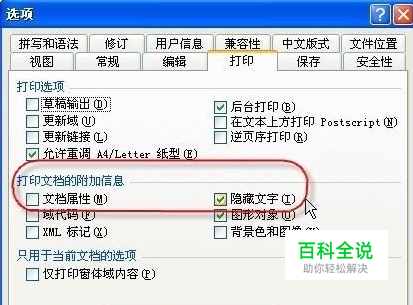 选中“打印文档的附加信息”下的“隐藏文字”复选项,如图所示。这样,打印时就会连同隐藏文字一并打印了。