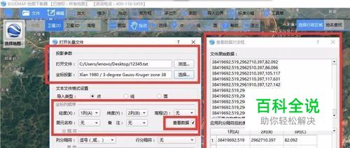 打开的对话框, 第一步选择要打开的文件; 第二步,勾选【查看数据】,会弹出右边的【查看数据对话框】窗口;我们可以看到我们要打开的数据内容和对应行【列】; 第三步,选择坐标投影;这里演示的数据是西安80坐标系下的三度带38带号;如果是经纬度坐标,则直接选择WGS84,如下图: