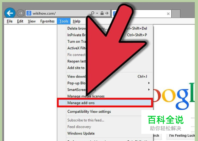 开启Internet Explorer。点击工具菜单,打开管理插件。