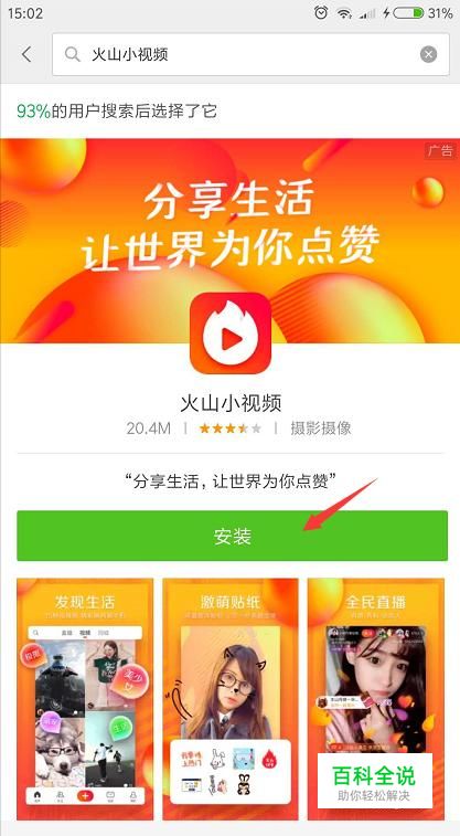 首先我们打开手机的应用商店搜索火山小视频并点击安装。