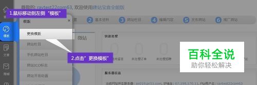 进入建站宝盒管理后台,点击首页左侧长导航的“①模板设置”,或者鼠标移到首页的左侧“模板”,点击“更换模板”