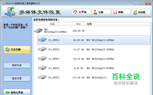 3.点击选择丢失数据的硬盘储存分区,再点击“完全扫描”按钮来扫描硬盘分区,等待扫描完毕,可以看到文件列表,如下图:
