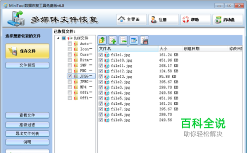 4.在这个文件列表中找到我们想要恢复的照片(软件提供“查找文件”和“高级过滤”功能来快速找到我们想要恢复的数据),然后勾选,再点击“保存文件”,我们将看到下面的这个界面: