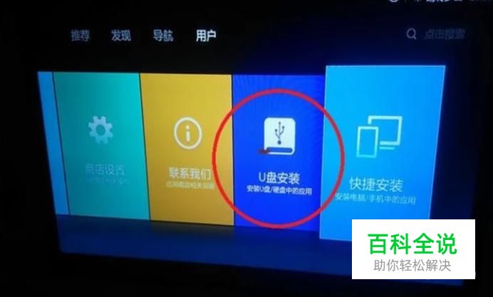 把U盘插到小米电视的USB接口上,点击电视上的用户,再点击U盘安装,可以看到U盘中的安装包,点击进行安装。