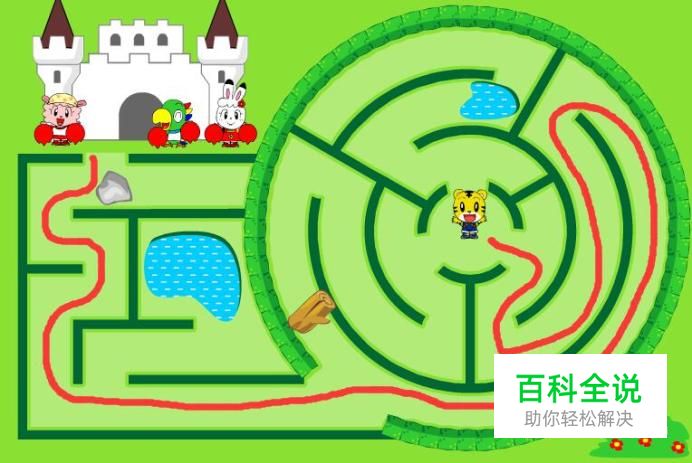 第一关是进入城堡的迷宫。巧虎在圆形的中间,然后沿着画红色线的地方走就能闯关成功了,非常方便,自己在找线路的时候一定要多注意,辨别哪些地方能走哪些地方有障碍物。