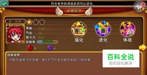 一、武将品质 二、武将技能 恢复型(气血):华佗 恢复型(气血+元素):徐庶 伤害+恢复型(气血):典韦 伤害+恢复型(气血+元素):赵云 暴击型:吕布、关羽 伤害转化型:吕蒙 防御型:姜维 消除型:周瑜 转化型:鲁肃 元素转伤害型:张飞、郭嘉、司马懿、左慈、庞统 三、武将养成 1. 武将强化 强化可以提高武将等级。更高的等级意味着更强的战斗力、武将技能 强化材料:经验书、粮草