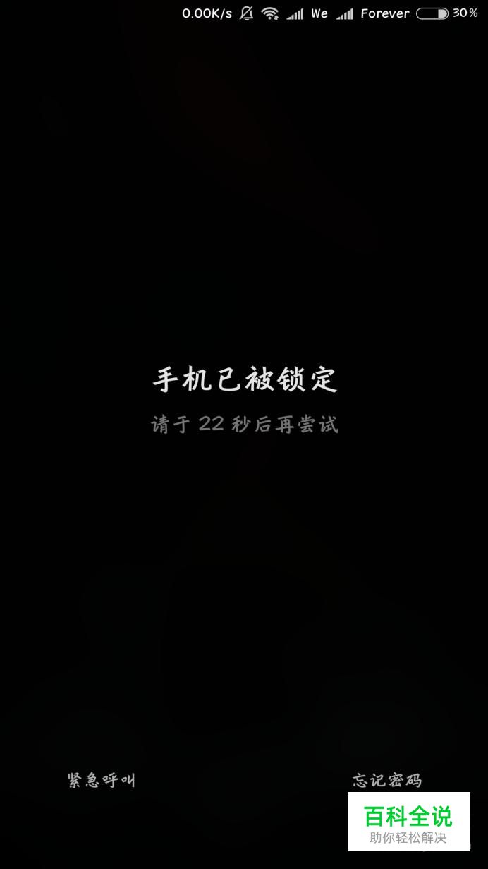 当输入密码错误超过5次之后,手机就会被锁定30秒,点击右下角的忘记密码