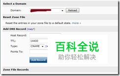 找到上图中DNS区域编辑器(DNS Zone Editor)图标,点击进入编辑DNS界面,在Select a Domain中选择你想创建CNAME的域名,在Add DNS Record下的Host Record中输入你先填写的名称,在TTL中输入你时间(按照默认的即可),在Type中选择CNAME记录,在Points To中输入目标地址,点击Add Record按钮。如图所示: