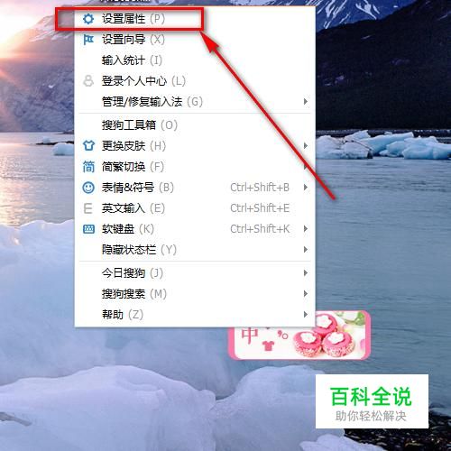 如图,在搜狗输入法图标上单击鼠标右键,会弹出一个菜单卡,里面有一个“设置属性”菜单。