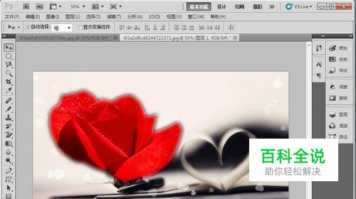 首先打开Photoshop,准备好两张图,我准备的图是要将红玫瑰移到心形背景图里