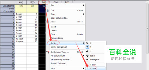 设置误差棒。选中误差列,右击,在弹出的快捷菜单中选择【Set As】-【Y Error】将相应的标准误差设置误差棒;若多个指标,则多次执行这个步骤即可。