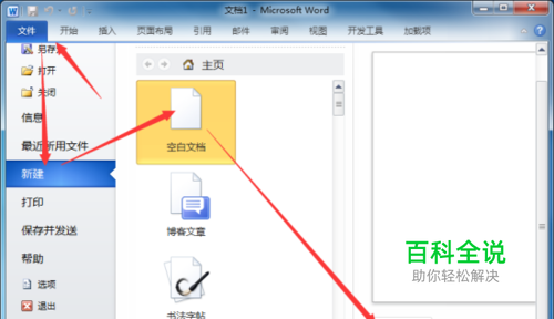 1、在计算机桌面双击Word2010图标将其打开运行,在启动的Word2010演示文稿编辑软件窗口,依次点击“文件”-->“新建”-->“空白文档”-->“创建”命令选项,新建一个空白的Word文档。如图所示;】